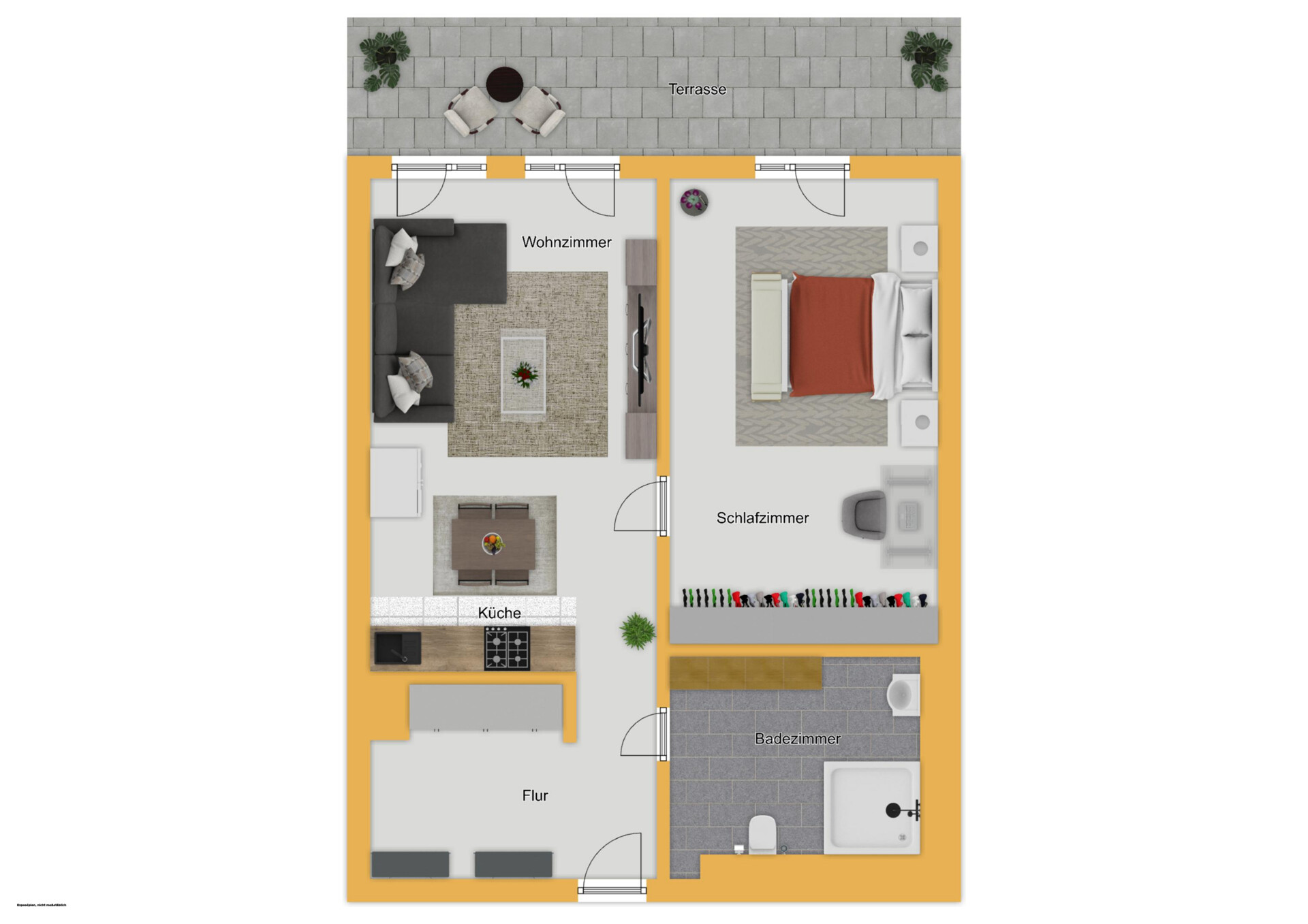 Das Schlafzimmer verfügt ebenfalls über ein bodentiefes Fenster mit Zugang zum Garten und wirkt durch den optimalen Zuschnitt besonders großzügig. Bett und Kleiderschrank lassen sich problemlos integrieren. Auch hier sorgt der einheitliche Vinylboden für ein stimmiges Gesamtbild. Der weitläufige Flur bietet zudem eine praktische Nische für einen großen Einbauschrank.