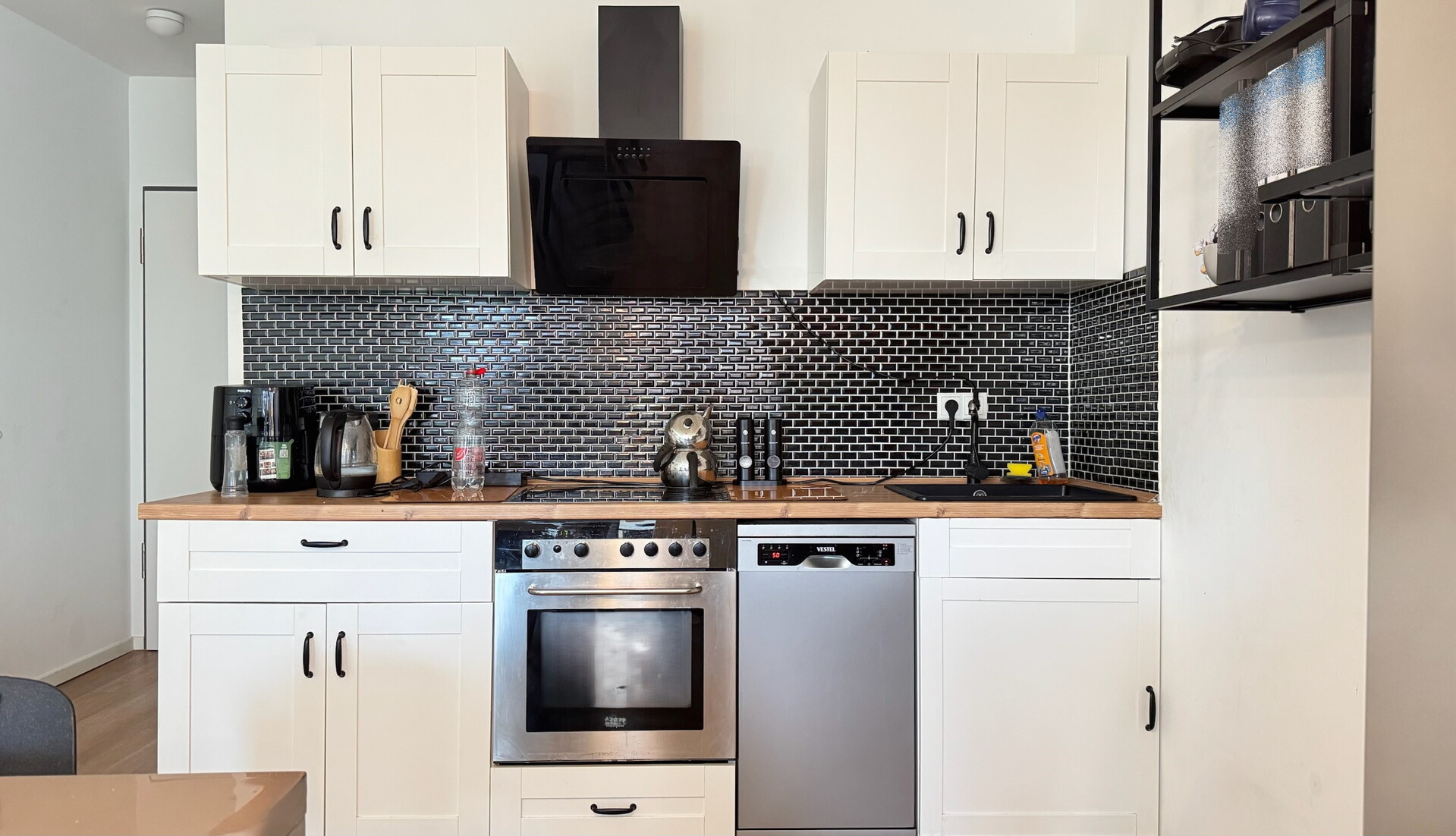 Beim Betreten des offenen Wohn- und Essbereichs fällt der Blick direkt in den gepflegten Garten. Zwei bodentiefe Fenster sorgen für viel Tageslicht und eine freundliche Atmosphäre. Die im Kaufpreis enthaltene Einbauküche mit weißen Fronten im Landhausstil und schwarzem Fliesenspiegel fügt sich harmonisch in den Raum ein. Der pflegeleichte Vinylboden unterstreicht die moderne Optik und bietet Platz für eine gemütliche Wohnlandschaft sowie einen Essbereich.