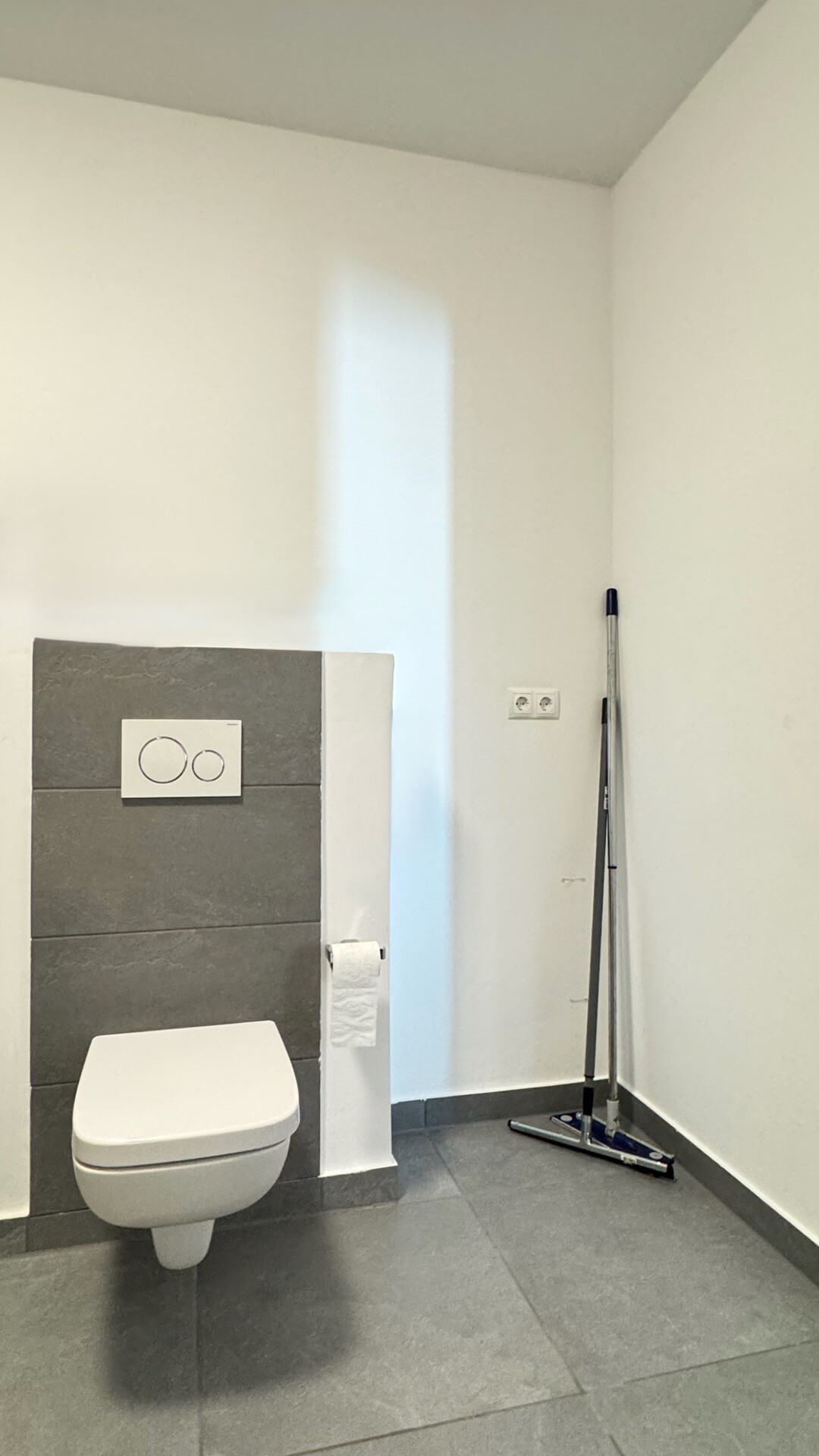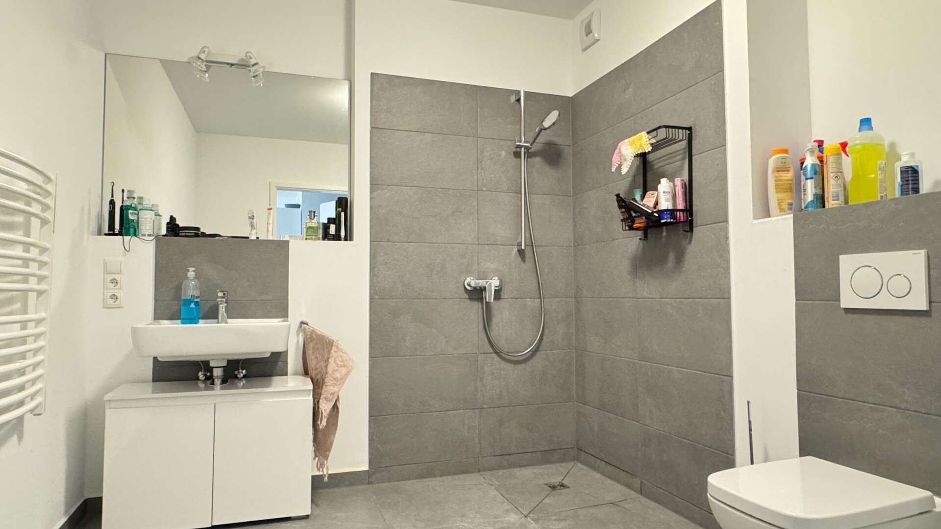Das barrierefreie Badezimmer ist mit zeitlosen grauen Fliesen gestaltet und bietet ausreichend Platz für Badmöbel sowie einen Stellplatz für Waschmaschine und Trockner. Ein Handtuchheizkörper sorgt für zusätzlichen Komfort.