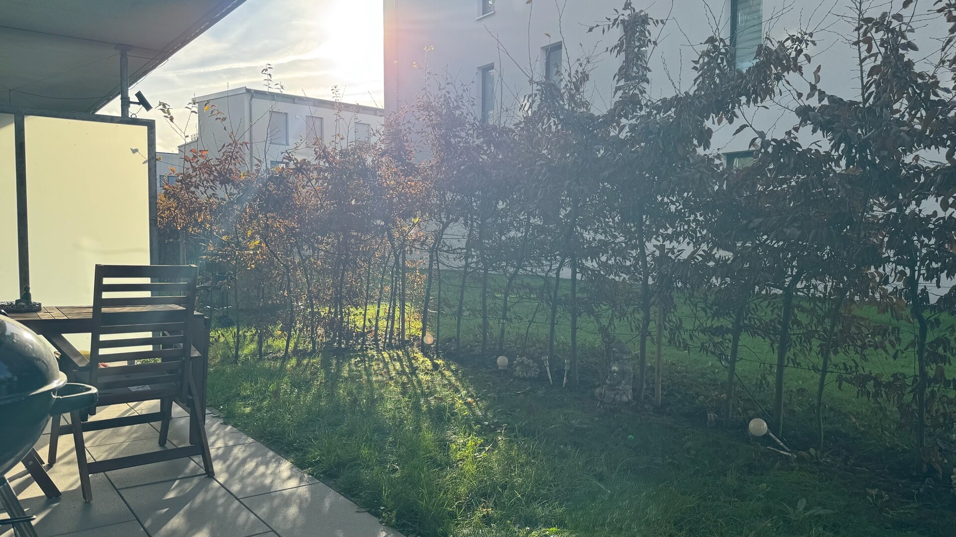 Die überdachte Terrasse ermöglicht entspannte Stunden im Freien bei jedem Wetter. Der anschließende, pflegeleichte Gartenbereich lädt zum Verweilen ein und bietet ideale Voraussetzungen für eine sonnige Sitzecke oder kleine Gartenprojekte.