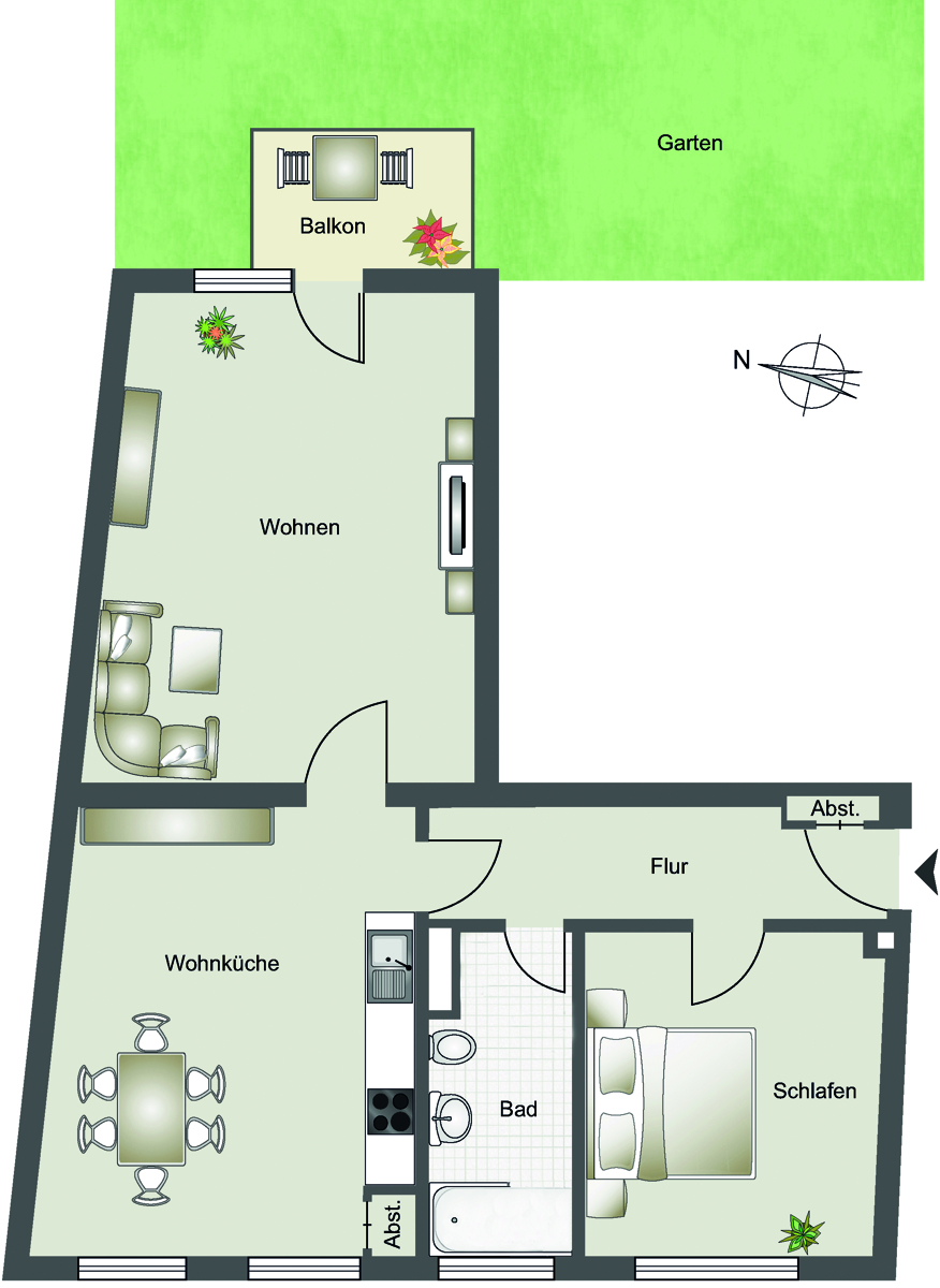 Die Erdgeschosswohnung überzeugt durch ihre klare Aufteilung: ein helles Wohnzimmer mit Balkon, eine gemütliche Wohnküche, ein ruhiges Schlafzimmer, ein modernes Tageslichtbad sowie ein praktischer Abstellraum.