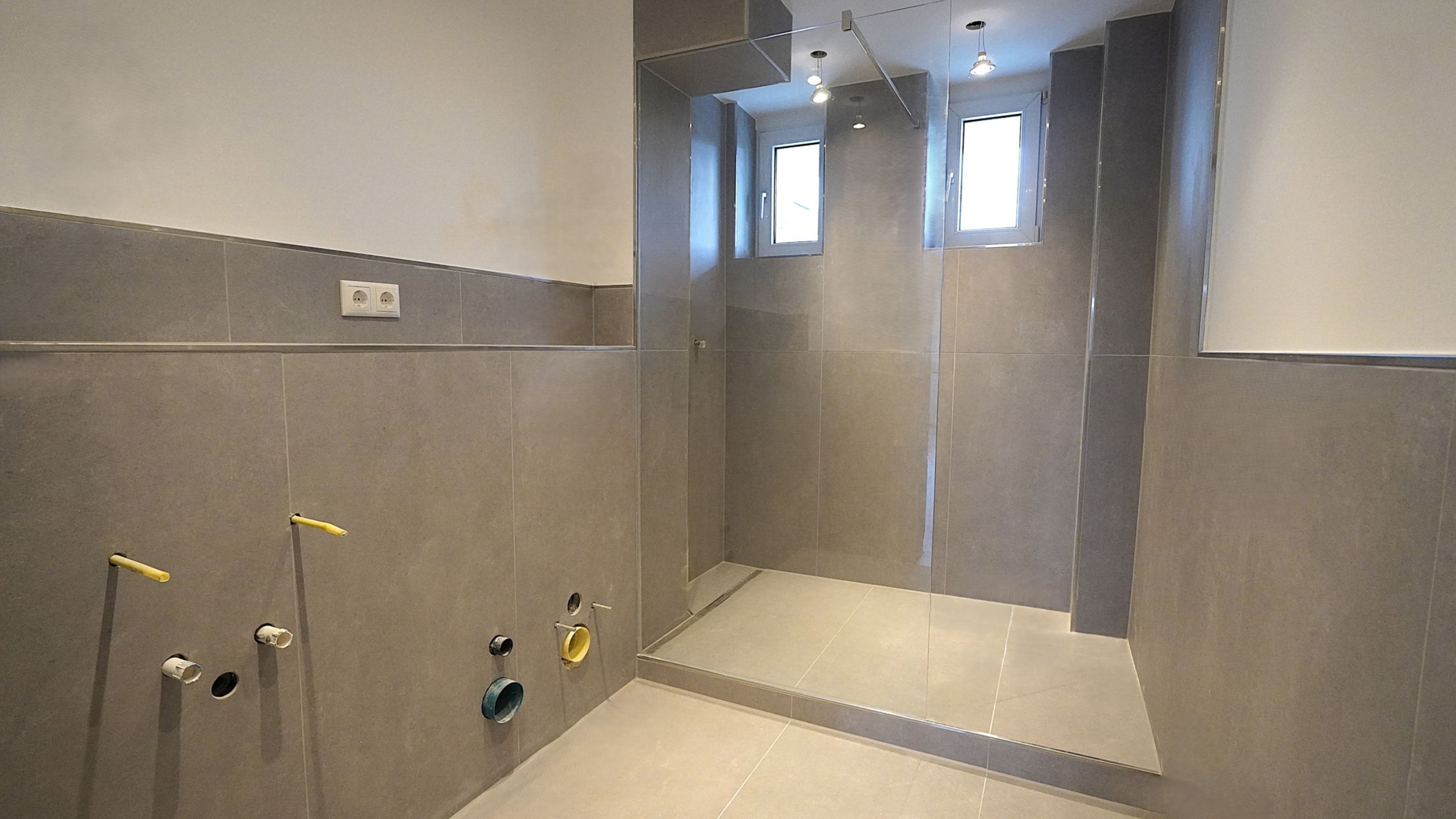 • Großformatige Wand- und Bodenfliesen in Grau