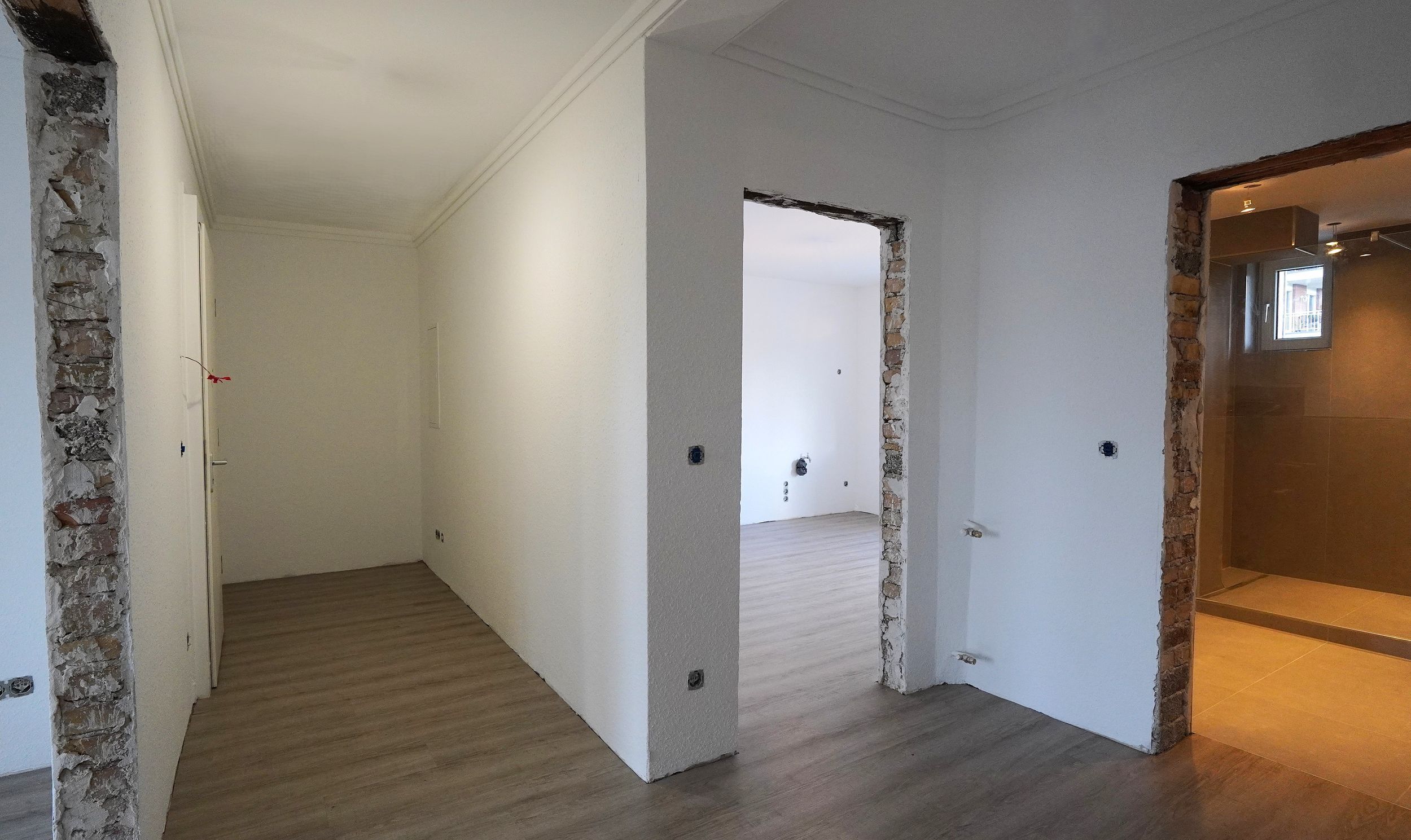Die Wohnung befindet sich derzeit in der Endphase einer umfassenden Kernsanierung. Wichtige Arbeiten wie Elektro- und Sanitär- Arbeiten sind bereits abgeschlossen. Noch ausstehend sind die finalen Arbeiten wie der Einbau von Fußleisten, Türen (im Wohn- und Esszimmer als elegante Glastüren, in den übrigen Räumen klassische Türen), Heizkörpern sowie die vollständige Ausstattung des Badezimmers mit Toilette, Waschbecken und Armaturen für Dusche und Waschbecken.