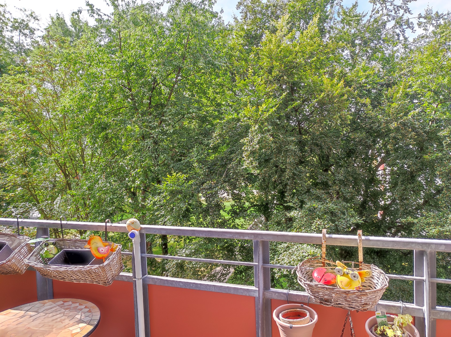 Von dem Südbalkon aus eröffnet sich eine herrliche Aussicht auf die Baumkronen im Grünen – der perfekte Ort für eine Auszeit. Er weist einen pflegeleichten Fliesenboden auf und besitzt einen nützlichen Einbauschrank, der weiteren Stauraum bietet. Das orangene Geländer setzt einen charmanten Akzent auf dem Balkon und komplettiert das harmonische Gesamtbild.