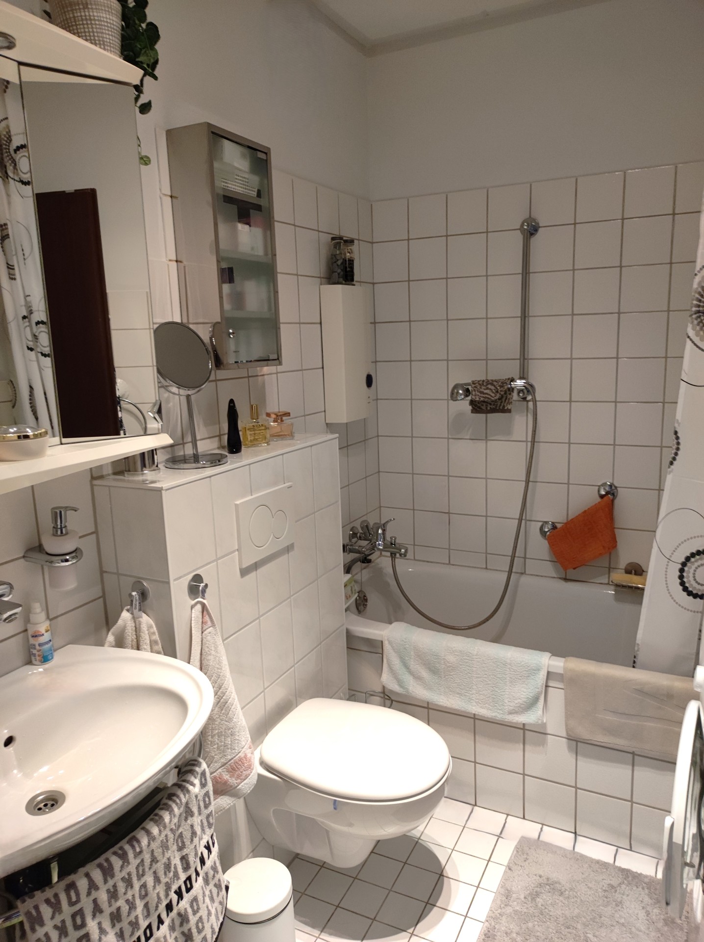 Das Badezimmer ist mit weißen, zeitlosen Boden- und Wandfliesen ausgestattet. Es verfügt über eine Badewanne, sowie ein Waschbecken. Des weiteren bietet das Badezimmer einen Anschluss für Waschmaschine und Trockner, sodass Sie bequem innerhalb der Wohnung Ihre Wäsche waschen können.