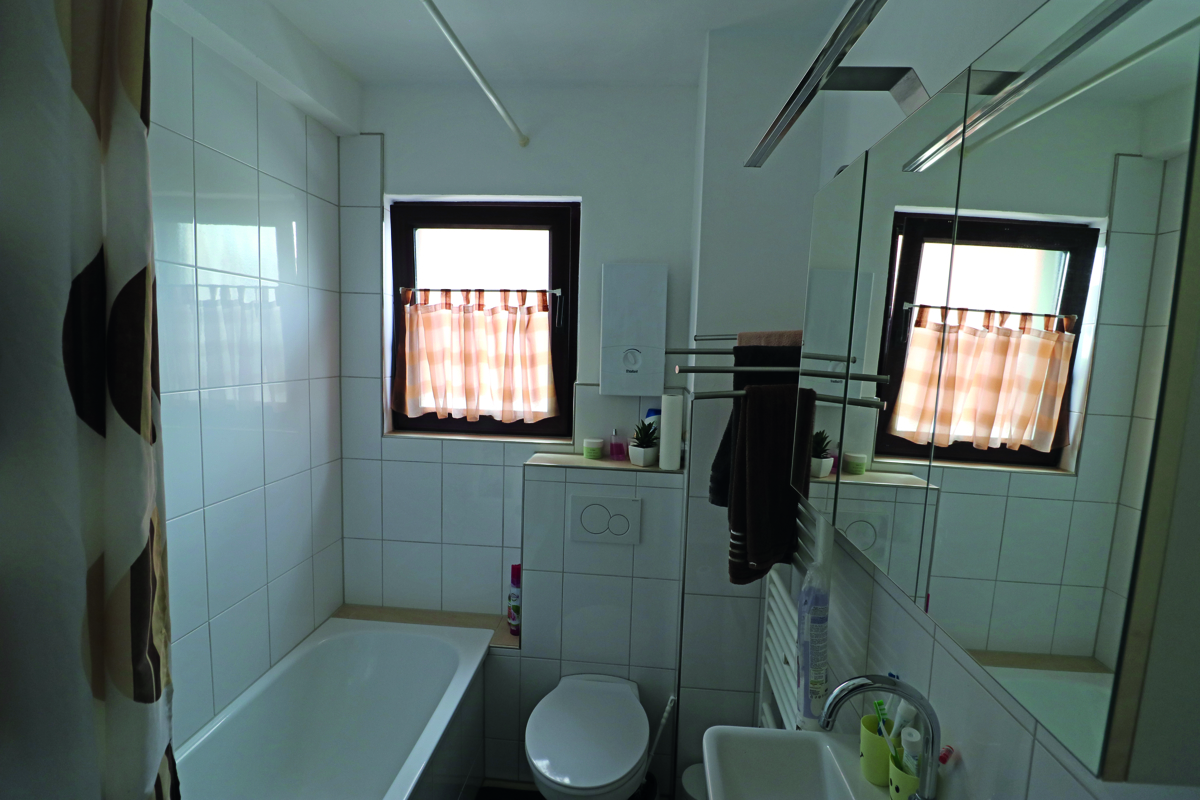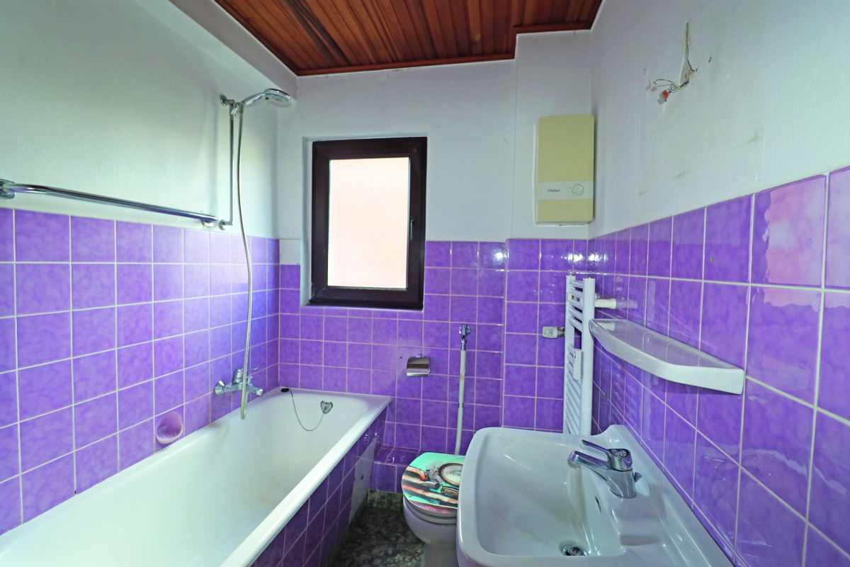 Die Ausstattung variiert: Während das Badezimmer im Erdgeschoss bereits modernisiert wurde, zeigen sich die Bäder in den oberen Etagen im älteren Zustand.